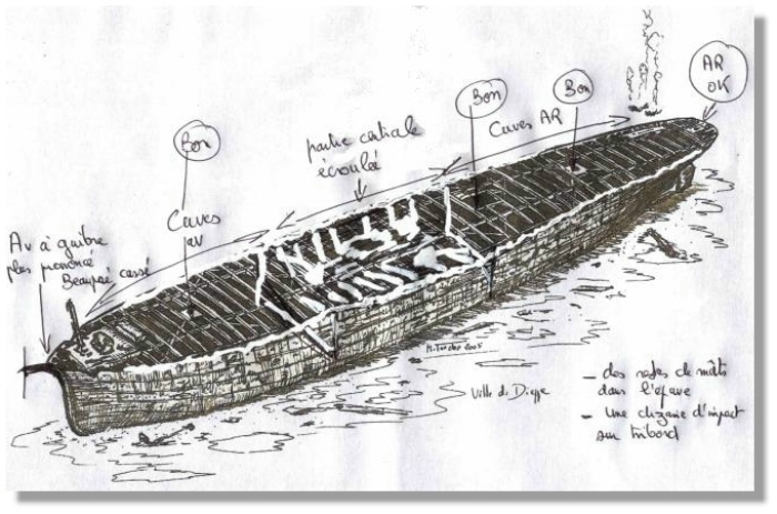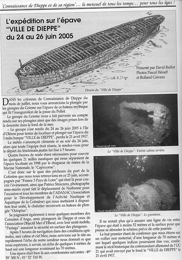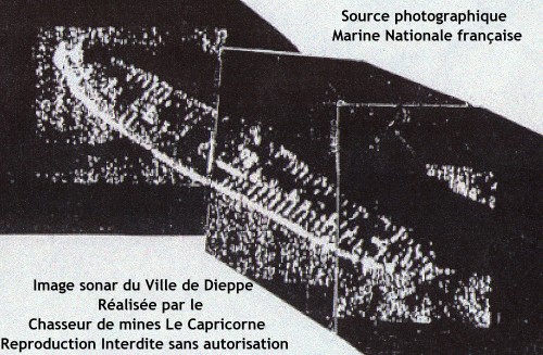Hélène et Fred qui étaient descendus les premiers n’ont pas croisés notre route. Ils ont du remonter en pleine eau. C’est ce que nous supposons avec Patrice après être remontés et cela se confirme. Nos deux amies sont en dérive avec un parachute de palier et sont suivis par Lionel et le Zodiac qui assure leur sécurité. Une fois remontés à bord comme Patrice et moi, Hélène et Fred nous confirment avoir vu l’épave. Le courant les ayant empêché de mettre le mouillage sur cette dernière, ils se sont aidés du scooter sous-marin pour aller sur le Ville de Dieppe afin de tenter de l'explorer, mais n’ont pas réussit à revenir sur la ligne de vie du fait d'un courant trop important, d'une visibilité réduite et surtout d'un temps de paliers trop long pour continuer à chercher cette ligne qui les aurait ramenés à la surface, mais peut être à court d’air ! Les bouteilles de sécurité étant sur la ligne de vie, ils ont préféré remonter en pleine eau avec une autonomie suffisante pour faire les paliers en toute sécurité. La décision est donc prise d’arrêter l’investigation. L’heure de la "renverse de courant" étant trop proche, force est de constater que le Ville de Dieppe tient à garder encore son secret. Néanmoins, les observations faites par Hélène et Fred nous permettent de corriger quelque peu le dessin que nous avions fait à partir de l’image SONAR que le chasseur de mines CAPRICORNE avait réalisé en 1998.