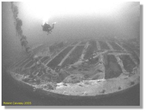 Cinq minutes passent, et ne voyant pas revenir ces deux plongeurs, il est décidé de "mettre à l’eau" Patrice notre photographe que j’accompagne pour la sécurité et le repérage de l’épave. Arrivé à –42/-43 m, le courant toujours présent, la visibilité réduite pour faire de la photo et la température de l’eau nous dissuadent. Il nous faut remonter pour prévenir des mauvaises conditions et de ce fait prendre une décision. Nous croisons sur notre remontée une autre palanquée, Jean Pierre et Patrick, qui comme nous, étaient prêts se sont mis à l’eau. Ils iront jusqu'à – 52 m, apercevront l’épave, mais la ligne de vie étant à 5 m de cette dernière et dérivant au courant, ils décideront de remonter aussitôt.