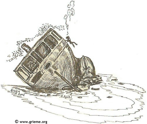| Au cours des manœuvres, le BRAGA heurte le pertuis de la passe Amiral-Rolland : un premier choc est d’abord ressenti sur bâbord, la violence du choc est telle que le navire est drossé sur le quai opposé. Une entaille dans le gré du quai permet de se faire une idée de l’ampleur de la collision. Malgré cela, jugeant l’incident de peu d’importance, le commandant Aagre décide de poursuivre sa route… Il ne procède même pas à l’inspection de sa coque ; cela causera la perte du BRAGA. À 11 h 30, alors que le cargo est à 25 milles de Dieppe, une voie d’eau est découverte à bord et le radio du bord réclame l’assistance d’un remorqueur. Néanmoins, le commandant ne pense pas que son navire soit en danger ; l’équipage s’occupe à colmater la brèche. Aucun S.O.S. n’est lancé ! À 13 h 10, la situation s’est aggravée et les pompes du navire n’arrivent plus à compenser l’eau embarquée. Le radio lance cette fois un appel au secours, le BRAGA commence à piquer du nez et il accuse une gîte assez prononcée. Mis en alerte, le remorqueur Balidar quitte Dieppe pour porter secours au BRAGA. Le commandant Simon, à bord du cargo Rennes affecté à la ligne Dieppe–Newhaven, l’un des premiers à capter le message de détresse du BRAGA, se détourne aussitôt. L’Abeille 20, qui a entendu l’appel de 11 h 30 du cargo norvégien, appareille du Havre à 11 h 55. Le navire anglais Meaching de Newhaven se déroute aussi. Des canots de sauvetage et un hélicoptère de la Royal Navy hâtent les préparatifs de départ. Forçant la vapeur, le Rennes est le premier à arriver sur les lieux alors que l’équipage abandonne le BRAGA à bord d’un canot et de radeaux. Le commandant Simon recueille 17 personnes (dont le capitaine Aagre et les deux passagers) tandis que le bananier Banora, qui se rend de Hambourg à Dieppe, sauve les douze derniers naufragés. À 15 h 38, le BRAGA se couche sur son flanc bâbord et bascule vers le fond, ne mettant que quatre minutes à disparaître dans les flots. Apprenant la nouvelle, l’Abeille 20 fait demi-tour. |