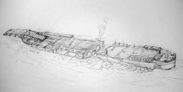 Malgré les craintes évoquées lors de la parution de La Saga des Épaves du Pays de Caux, les gravats rejetés en mer suite à la construction du nouveau terminal Trans-Manche n’ont pas affecté l’épave. On en retrouve ça et là sur le pont principal arrière et autour de l’épave, mais pas au point de la dénaturer. Sûrement l’une des plus imposantes épaves de la région, le H.M.S. Daffodil mesure 107 m de long pour 18 m de large. Facile à trouver de par sa taille, il convient néanmoins de se méfier de ne pas la confondre avec les gravats que l’on retrouve tout autour. Les données du sondeur, aide précieuse, doivent être interprétées avec discernement. En effet, l’appareil peut vous signaler un écho entre 4 et 6 m par endroit. Attention donc à ces informations trompeuses qui ne matérialisent pas l’épave à coup sûr ! |