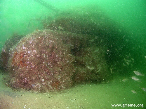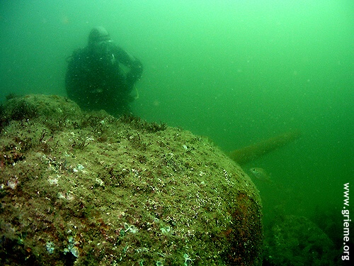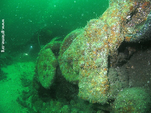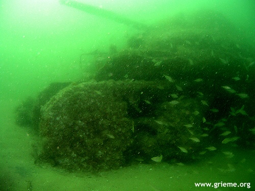 C’est vers l’arrière que je palme. Henry nous a recommandé d’éviter de pénétrer à l’intérieur. La barge est retournée et les énormes moteurs diesel tomberont bien un jour ! Néanmoins, de l’extérieur, je peux les apercevoir en partie. Les bars en ont fait leur domaine et ils sont innombrables dans la pénombre de la salle des machines. L’arrière a moins souffert et la forme de la coque, les arbres d’hélices se dessinent sur le fond vert de la Manche. Les deux hélices ont disparu, probablement ferraillées. Leur taille devait être respectable, celle d’un homme probablement. L’épave est en mauvais état, et la prudence est de rigueur. Respectant les consignes de Henry, nous nous sommes bien gardés de pénétrer loin dans l’épave. Malgré son délabrement, son exploration reste un grand moment d’émotion, et la vision de ces chars renversés évoque à elle seule la violence de l’explosion. Nous n’avons pas perdu de vue le grand nombre de soldats dont la vie a été emportée ce 19 juin 1944, et cette épave est gravée dans ma mémoire comme un témoignage de leur sacrifice.