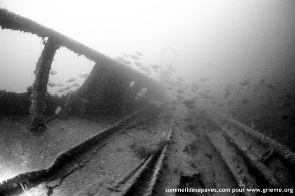 Consultant mon ordinateur, je fais signe à Éric qu’il nous faut faire demi-tour pour revenir au mouillage se trouvant sur la poupe suivant les directives du directeur de plongée. Consultant lui aussi ses paramètres, il acquiesce d’un signe et nous remontons sur le gaillard d’avant. Au débouché des chaudières, nous croisons François, que je salue de manière militaire, et poursuivons avec Éric notre flânerie dans la cale arrière. Sur tribord, Éric me montre le reste du double bordage de coque de la cale encore en place. Arrivé au mouillage, au pied de la mèche du gouvernail, j’entends l’ordinateur d’Éric qui « bip » pour l’informer de la fin de plongée sans palier, puis c’est le mien qui me rappelle à l’ordre. Nous entamons la remontée le long du bout qui s’agite furieusement sous les coups de bélier du Narcose. Je me dis qu’à la surface, la houle a dû forcir. Au palier des 3 m « variables », mon ordinateur m’indique « no déco », mais ce n’est pas le cas pour Éric que je me dois d’accompagner pendant 1 minute. Nous regardons la coque plus loin derrière nous qui n’en finit pas de rebondir au passage des vagues. |