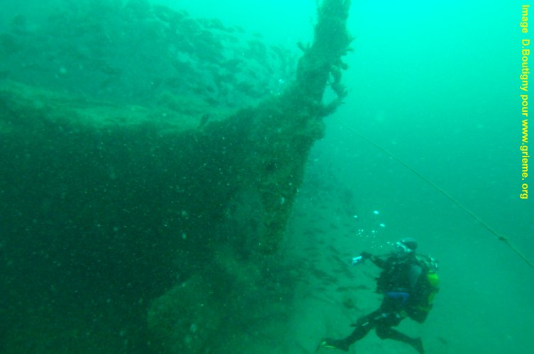 | (Un plongeur du GRIEME le long de la coque du Pylades) |