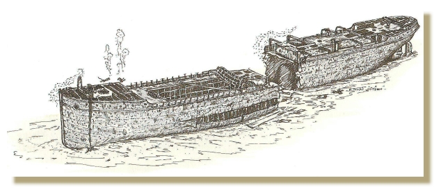 Coupée en deux, une faille de plus de 10 mètres sépare les morceaux. Le passage d'un morceau à l'autre ne pose pas de difficulté, mais veillez toujours à la profondeur. L'étrave, verticale est posée bien droit sur le fond. Le canon de l'avant est tombé. Une impression de désordre règne sur l'avant de l'épave.