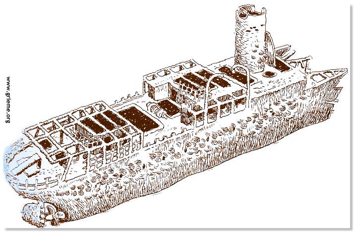 - Un troisième et dernier morceau (superstructure), gît non loin de la partie précédemment citée. A noter que les deux morceaux principaux sont voisins, parallèles et en sens inverse, à moins d'un mille à l'est du Petit Saranier. Ci-contre une partie de la cheminée.