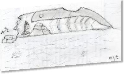 Allure générale de l'épave (Croquis H.BOYENVAL & P.CANNESSANT/GRIEME)Vision surprenante que cette épave ! A -30 mètres de profondeur, la proue surgit du bleu tandis que l’on distingue le Diamant qui repose sur tribord, à 80 degrés, dans son linceul de vase.