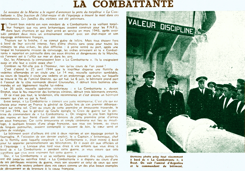 Pourquoi ? LA COMBATTANTE a joué un rôle important dans le déroulement des opérations navales dans notre région. Plusieurs ouvrages relatent l'histoire de ses faits de guerre et de ses batailles. Les marins qui servirent à bord de ce bateau appartiennent à l'histoire. Ils ont lutté pour l'honneur de la France Libre afin que notre pays recouvre sa dignité. Certains d'entre eux sont encore vivant à l'heure actuelle, dont deux personnes que le GRIEME a rencontré : Mr Jacques ZANG (Contre-Amiral de réserves) et Mr Louis HARRE, tous deux servirent à bord de LA COMBATTANTE et Jacques ZANG est l'un des rescapés du naufrage du 23 février 1945. LA COMBATTANTE fût une pépinière de futurs amiraux ; 7 en tout, dont ses deux commandants et 5 de ses officiers.