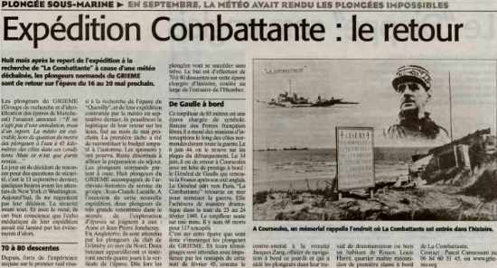 L'histoire exceptionnelle de La Combattante nous semble digne d'un dernier volet écrit autour d''une expédition de plongée organisée sur le site de son naufrage. Comme nous l'avons fait pour le QUEVILLY/DEODATA et ce qui nous a conduit, passionnés que nous sommes, à la création du GRIEME, nous avons jeté il y a quelques années les bases de cette nouvelle aventure. Ce sera donc L'Expédition La Combattante du 16 au 20 mai 2002, projet auquel s'associeront plusieurs partenaires, dont des "anciens de LA COMBATTANTE" qui se sont manifestés auprès du GRIEME.