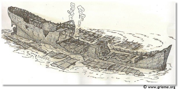 La cale avant laissera, elle aussi, apparaître une partie de la cargaison et le final se fera sur la proue qu’il faudra deviner dans l’enchevêtrement des tôles ou une des ancres se trouve encore à poste.