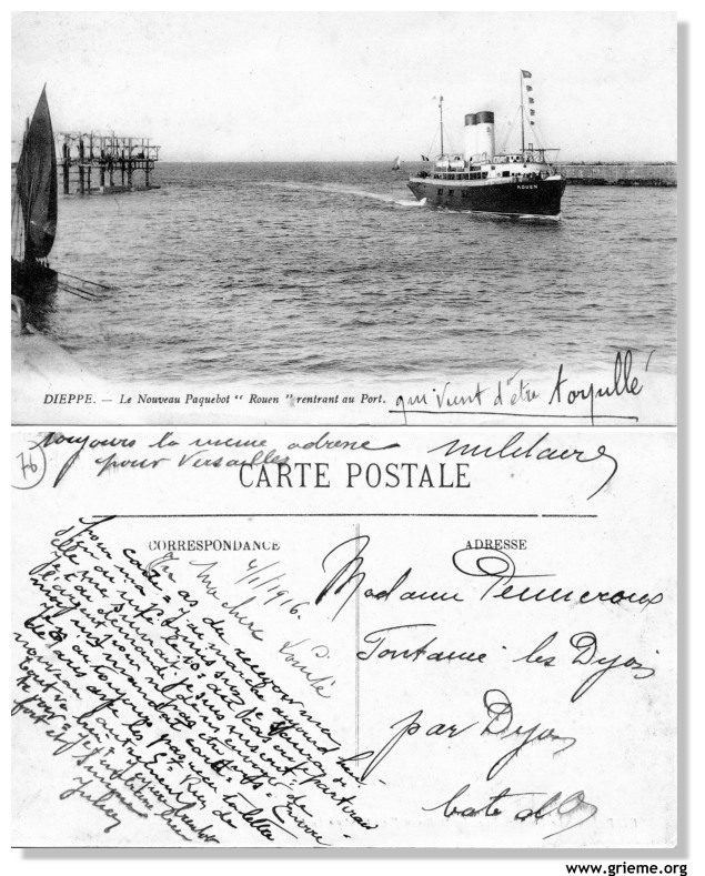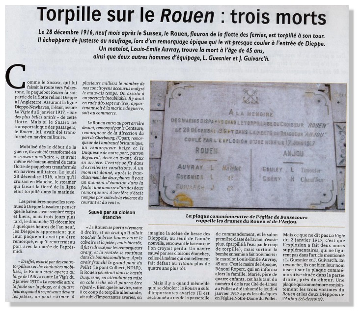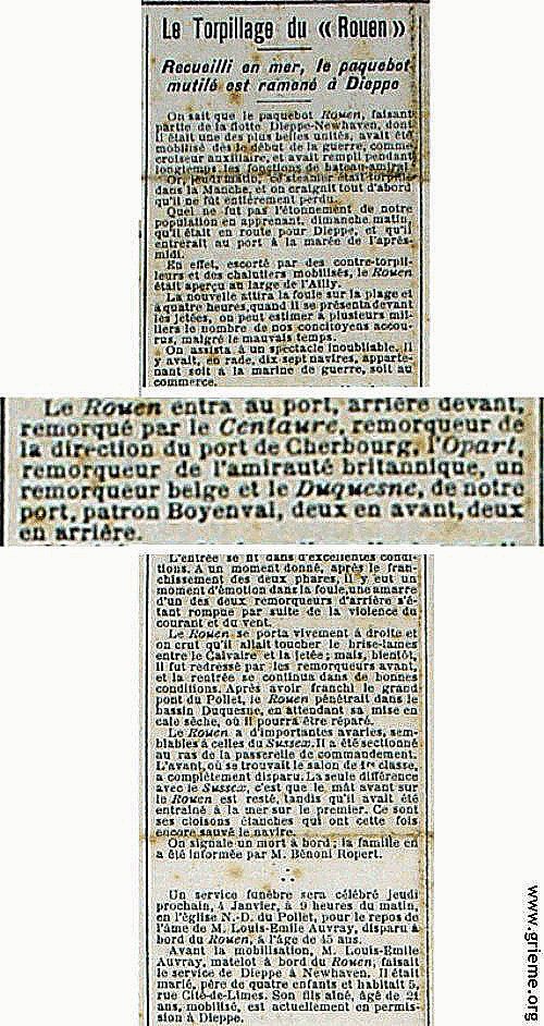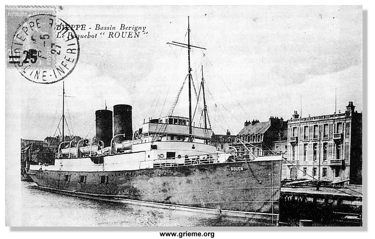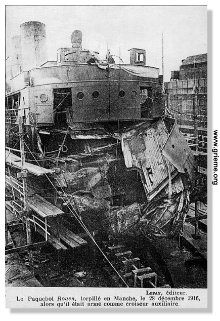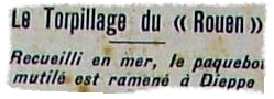 C'est vers la fin décembre de cette année que la nouvelle se répand comme une traînée de poudre dans Dieppe. Le paquebot ROUEN a été torpillé en Manche !