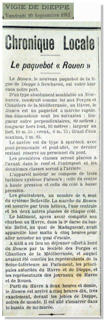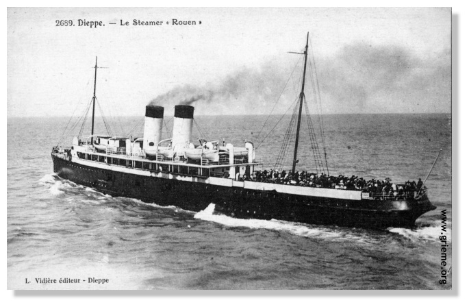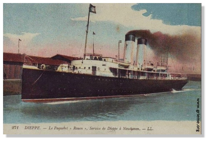 Le paquebot a été lancé au Havre le 18 mai 1912 et il est accueilli à Dieppe le 19 septembre de la même année. Très vite, le ROUEN conquiert le coeur des Dieppois qui voient d'un oeil bienveillant l'arrivée de cette unité sur "la Ligne" (Dieppe-Newhaven). Le paquebot en sera d'ailleurs l'un des fleurons en compagnie du Newhaven, avec qui il partagera de nombreuses péripéties pour achever une carrière bien remplie dans les mêmes tristes conditions.