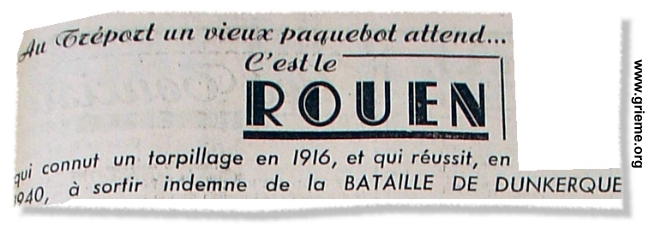 Dunkerque, 1940. Le ROUEN va s'illustrer de très belle manière. Le 11 mai 1940, le navire faisait partie d'un convoi devant entrer à Flessingue, mais à peine avait-il mouillé en rade que les avions allemands apparurent. Les bombes tombèrent autour des navires qui ripostèrent de toutes leurs pièces. Le ROUEN leva l'ancre le premier et son commandant, le Capitaine ROBERT, malgré le bombardement qui continuait avec intensité, entra dans le port avec sa précieuse cargaison humaine.
