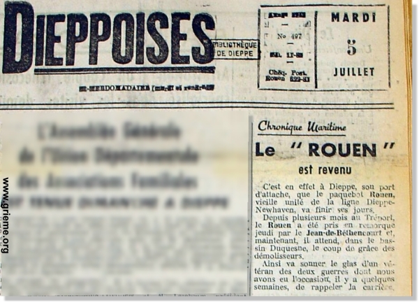 Enfin, le paquebot terminera sa vie par une mise au rebus dans l'arrière port de Dieppe, pour finir quelques semaines plus tard entre les mains des ferrailleurs du Tréport (Seine-Maritime).