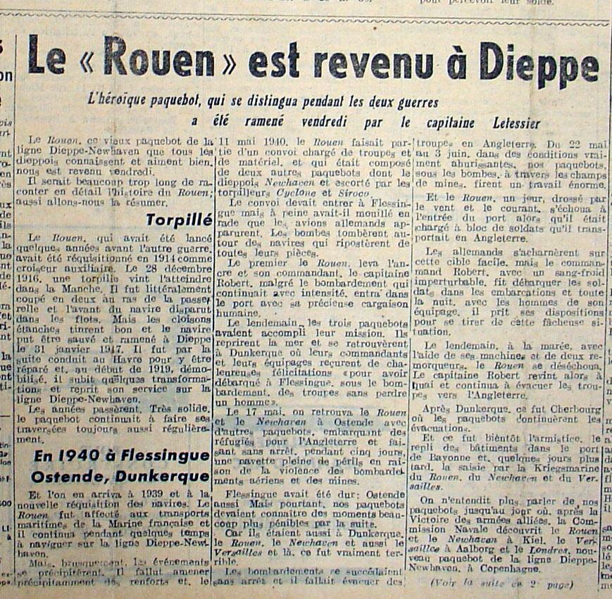 Le 17 mai (hasard ou coïncidence), on retrouva le ROUEN et son frère de ligne le NEWHAVEN à Ostende avec d'autres paquebots, embarquant des réfugiés pour l'Angleterre et faisant sans arrêt, pendant cinq jours, une navette pleine de périls en raison de la violence des bombardements aériens et des mines.