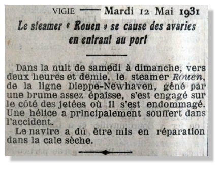 La crainte de perdre ce navire était dans toutes les têtes et son équipage avait d'ailleurs abandonné le navire. Quelques jours plus tard, une autre nouvelle aussi sensationnelle se mettait à circuler dans la ville. Le steamer serait en route pour DIEPPE et entrerait au port à la marée de l'après-midi !