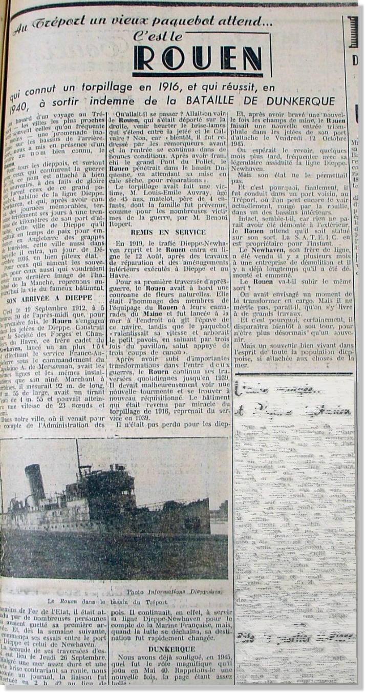 Les recherches et les contacts pour élaborer ce document a permis de réveiller l'histoire. L'histoire d'un superbe navire, le ROUEN, qui fit la fierté des Dieppois.