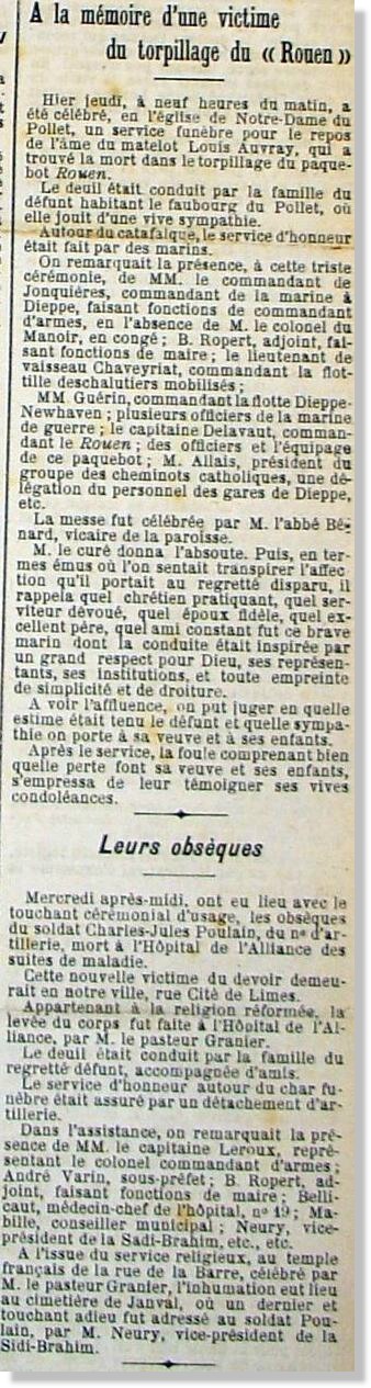 Le torpillage avait fait une victime, Monsieur Louis-Emile AUVRAY, âgé de 45 ans, matelot, père de quatre enfants, dont la famille fût prévenue. Une cérémonie religieuse fût organisée en mémoire de la victime.