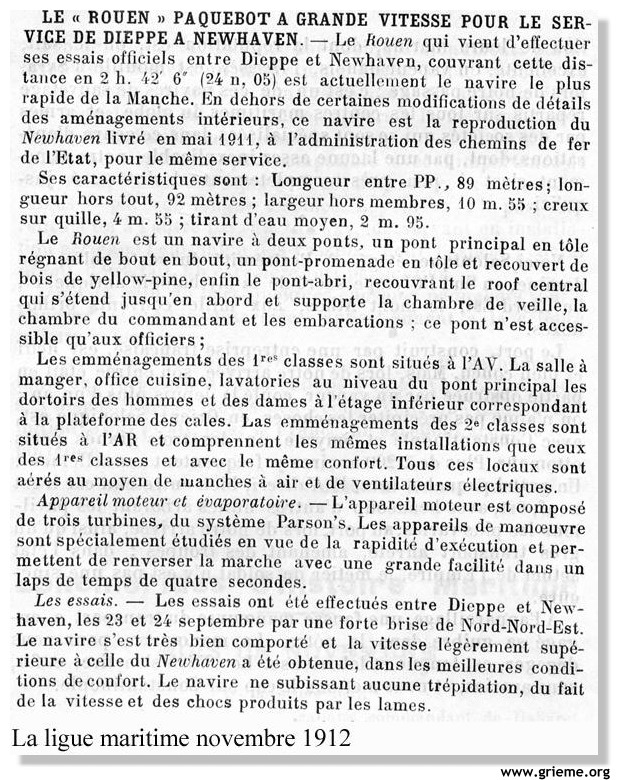 En septembre 1912, le paquebot effectue plusieurs essais de navigation. Le jeudi 26 septembre 1912, alors que la mer est agitée et formée, qu'une houle contraire vient contrarier sa route, le ROUEN effectue la traversée Dieppe-Newhaven en 2 h 42 au lieu de 2 h 50. Dès lors, le paquebot n'aura de cesse de franchir La Manche avec la même régularité.