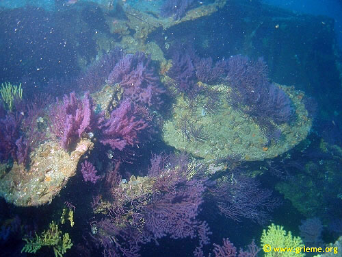 Toutes les œuvres vives sont facilement identifiables, aisément explorées, y compris les cales encore chargées de tonneaux. Le château arrière porte encore une grosse barre à roue en fer, et, juste en avant, une grande hélice de rechange en fer est solidement amarrée sur le pont. Si l’on va vers l’arrière du navire, il est possible d’aller voir l’hélice encore en place et l’immense gouvernail, les deux étant recouvert de gorgones superbes comme l’illustre la photo de J.P. JONCHERAY.