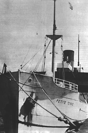 La Petite Terre à gauche ou Donator, une épave mythique de Méditerranée lors d'une escale au port de Rouen (Observez le mât caractéristique, aujoud'hui tombé côté bâbord de l'épave) Source : Musée Maritime de Rouen - HAROPA - Port de Rouen (Avec l'aimable autorisation de la Direction de la Communication d'HAROPA en date du 7 juillet 2017)