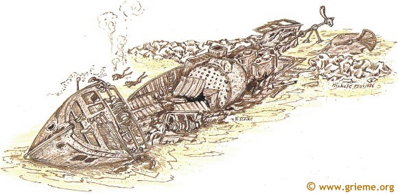 L’épave s’étend sur plus de 50 mètres, disloquée, et la reconstitution de sa forme primitive est fort délicate. L’étrave, bien droite, bien conservée, supporte encore une des deux ancres à jas et sa chaîne, l’autre ancre gisant sur le sol. Les bossoirs restent en place. La chaîne de l’ancre bâbord, couchée sur le sable, pénètre encore dans l’écubier du navire et se perd à l’intérieur. Le pont a disparu et la lumière entre à flot entre les barrots rouillés qui ne supportent plus de plancher de bois.