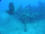 Continuant vers l'arrière, on découvre les deux machines double expansion. Nous allons aborder maintenant la partie la plus curieuse du Michel C ; a poupe avec une de ses hélices en fer, qui a perdu toutes ses pales sauf une, pointée au bout d’un arbre qui ne tient plus à rien. Tout cela est en pleine eau, et vraiment inattendu, par 32 mètres de profondeur. Un peu plus bas sur bâbord, le pont arrière a basculé en bloc, et on peut observer des sortes de barrots rayonnant à partir de l’axe du gouvernail, barrots nus et recouverts de concrétions.
